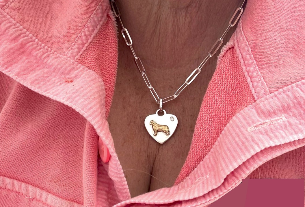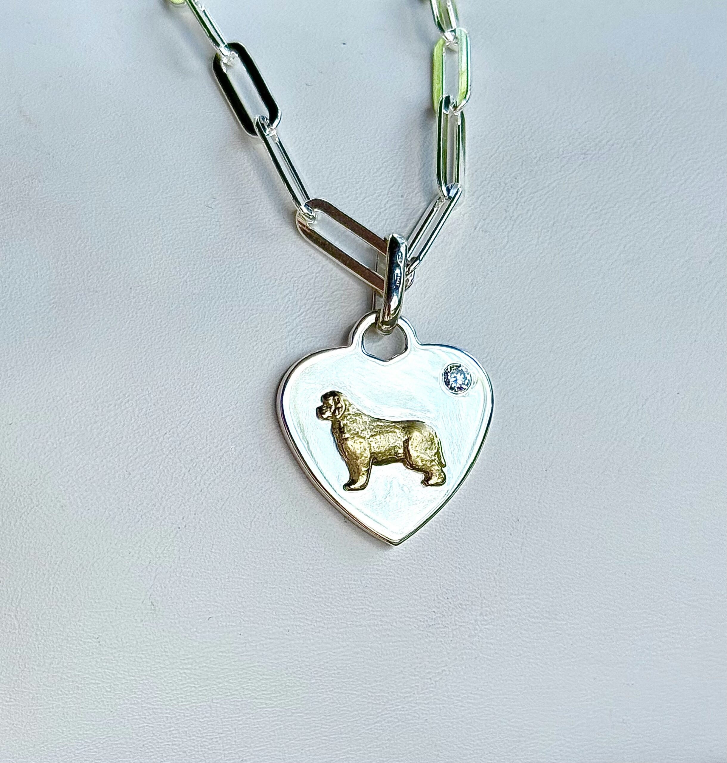 Newfoundland Flat Heart Pendant onPaper Clip chain – Sterling and Solid 18ktyg